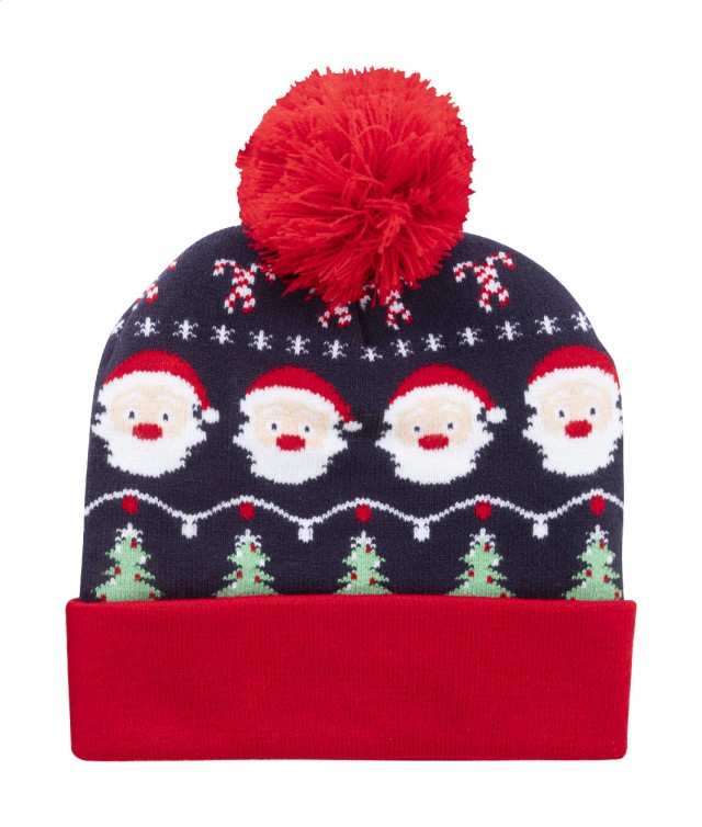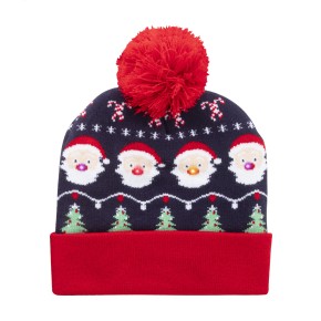 Pletená vánoční čepice z akrylu se 6 LED světly (3 režimy svícení), manžetou a bambulí. S knoflíkovou baterii.