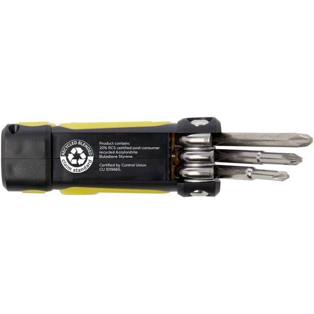 Kompaktní sada šroubováků 8 v 1 se svítilnou vyrobená z 20% recyklovaného plastu s certifikací RCS. Standard Recycled Claim Standard (RCS) ověřuje recyklovaný obsah produktu v celém dodavatelském řetězci. Tento praktický nástroj obsahuje 2 LED světla, 3 hlavy křížového šroubováku a 3 hlavy plochého šroubováku. Dodává se se třemi bateriemi LR44. Zabaleno v dárkové krabičce STAC z udržitelných zdrojů.