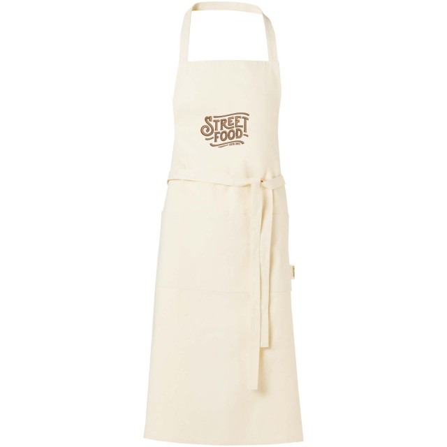 Zástěra ze 100% organické bavlny z Indie s certifikací OCS o gramáži 200 g/m² se 2 kapsami o celkové velikosti 45 × 20 cm a zavazováním na zadní straně o délce 1 metru. Délka popruhu kolem krku: 55 cm.