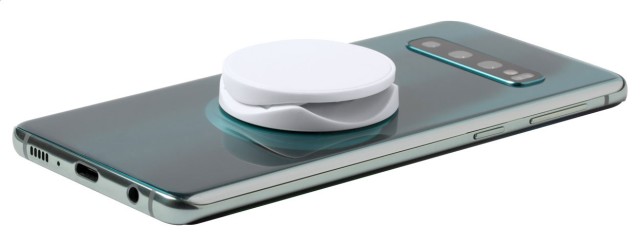 Kulatý, plastový stojánek na mobil s kroužkem na prst se samolepící stranou.