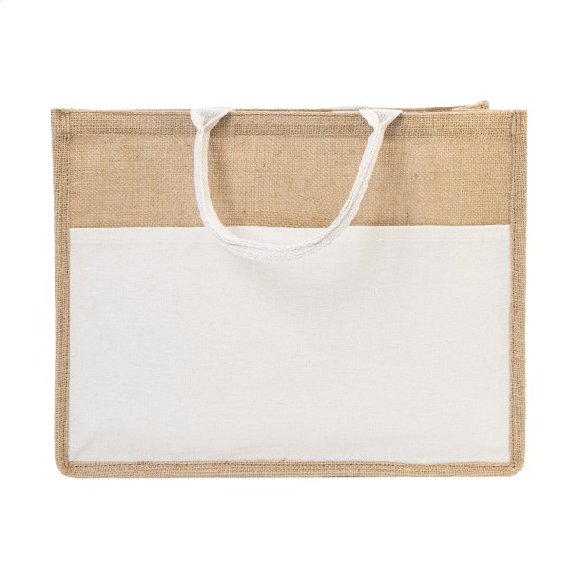 Plážová taška z laminované juty s bavlněnými uchy a přední kapsou.