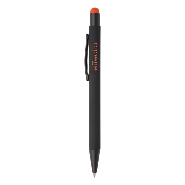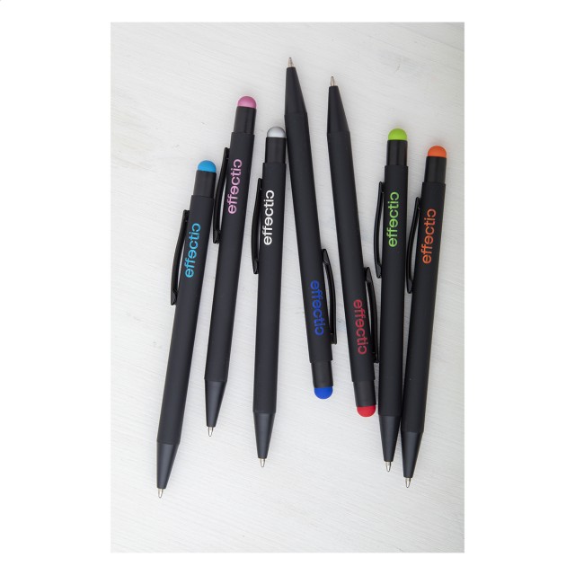Hliníkové kuličkové a dotykové pero s pogumovanou úpravou a speciálním povrchem pro zrcadlový laser v barvě stylusu, s modrou náplní.