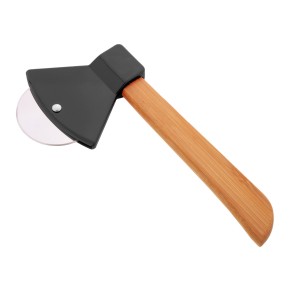 Kráječ na pizzu ve tvaru sekery s bambusovou rukojetí a čepelí z nerezové oceli.