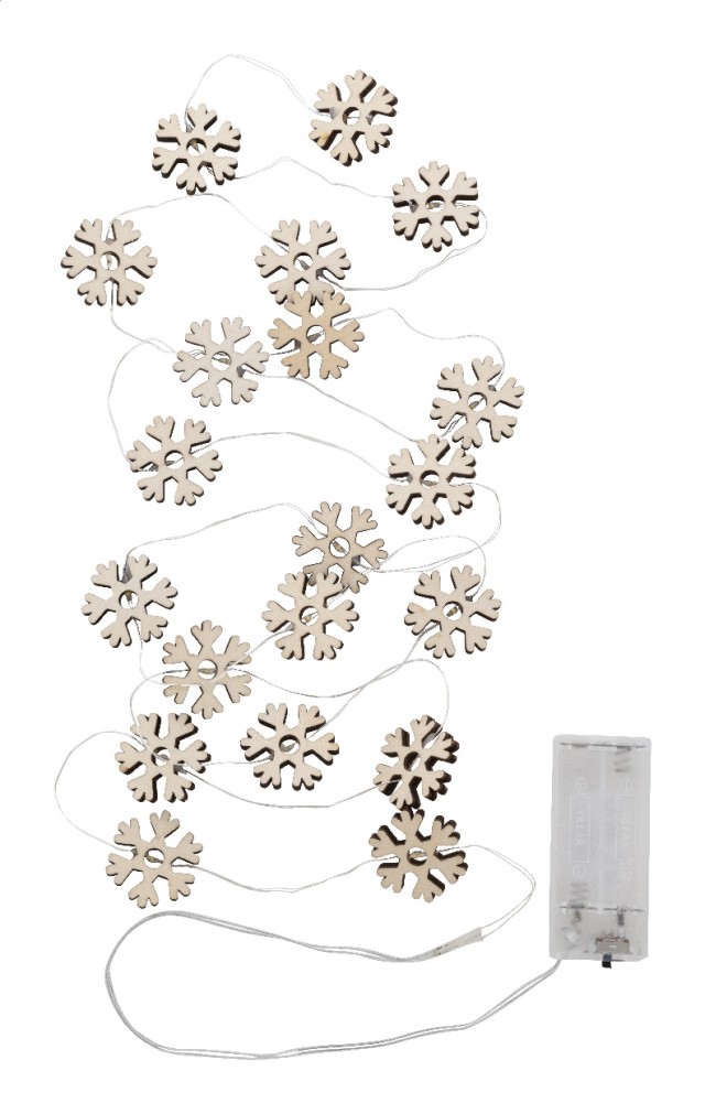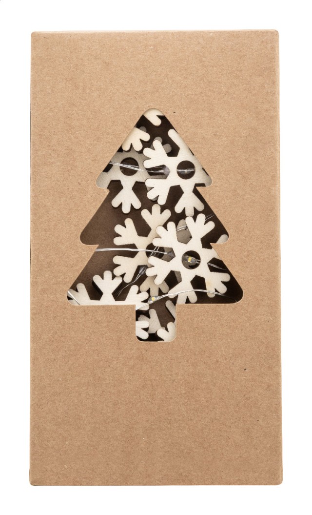 Vánoční světelná dekorace s 20 LED světly ve tvaru dřevěné sněhové vločky. Funguje na 2 AA baterie, bez baterií. S tlačítkem ZAP/VYP na pouzdře na baterie. V krabičce z kraftového papíru.