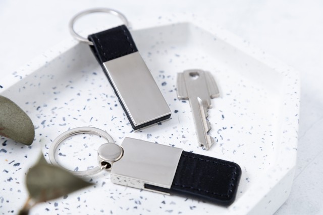 Kovový přívěsek na klíče s řemínkem z PU kůže. V kraftové papírové krabičce.