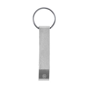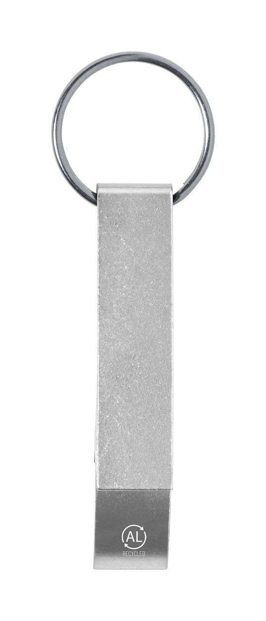 Otvírák na láhve a plechovky z recyklovaného hliníku s kovovým kroužkem na klíče.