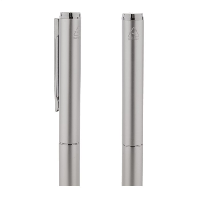 Sada pera z recyklovaného hliníku s rollerem a kuličkovým perem v černé papírové dárkové krabičce. S modrou náplní.