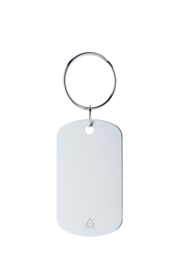 Přívěšek na klíče z recyklovaného hliníku s kovovým kroužkem.
