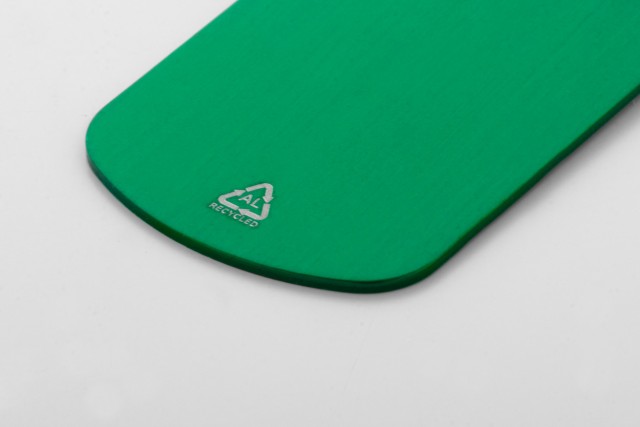 Přívěšek na klíče z recyklovaného hliníku s kovovým kroužkem.