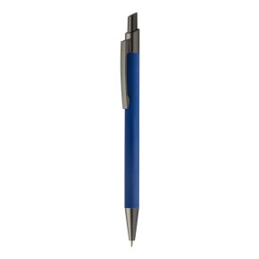 Kuličkové pero z recyklovaného hliníku s pogumovaným tělem a kovovými částmi. S modrou náplní.
