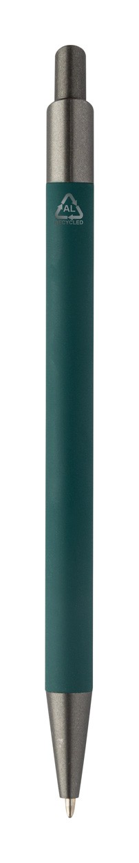 Kuličkové pero z recyklovaného hliníku s pogumovaným tělem a kovovými částmi. S modrou náplní.