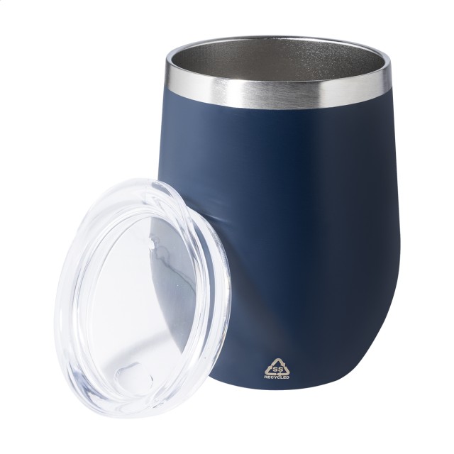 Dvoustěnný termo hrnek z recyklované nerezové oceli s plastovým víčkem na pití. 350 ml.