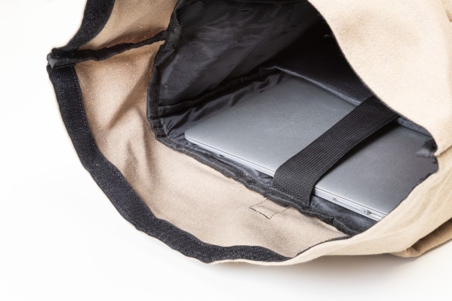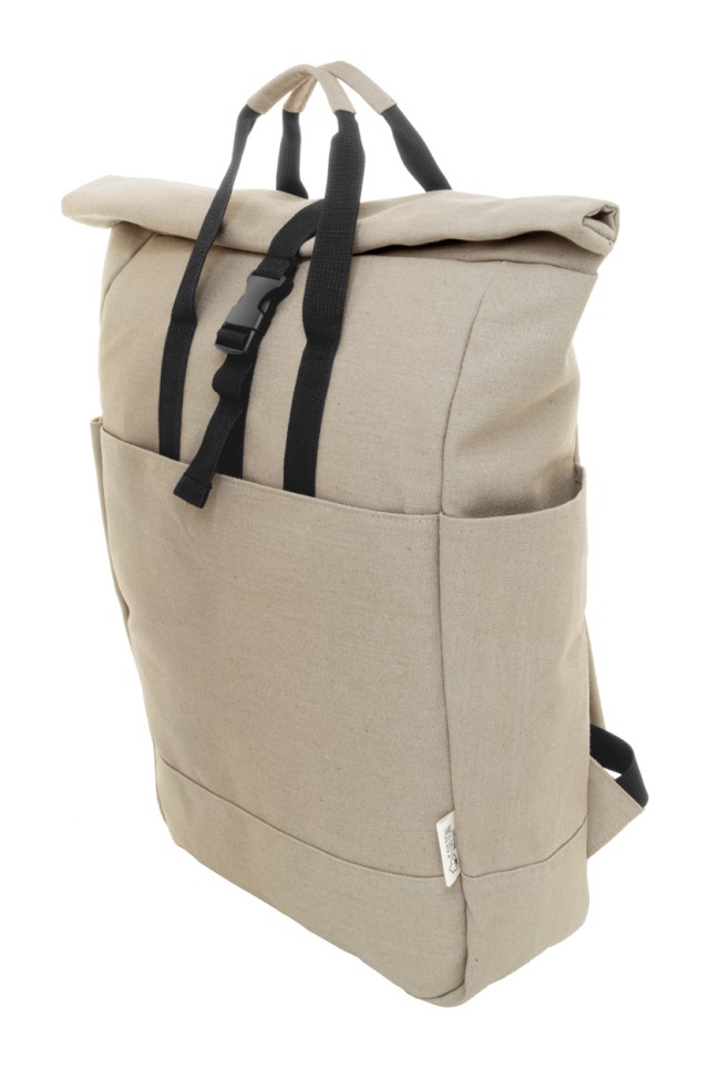 Rolovací batoh z recyklovaného plátna se zapínáním na přezku a suchý zip, polstrovaná přihrádka na notebook (15"), přední a boční kapsy. S popruhem na vozík, polstrovaná záda a ramenní popruhy. 70% recyklované bavlny a 30% RPET polyesteru. S výrazným štítkem z recyklované bavlny.