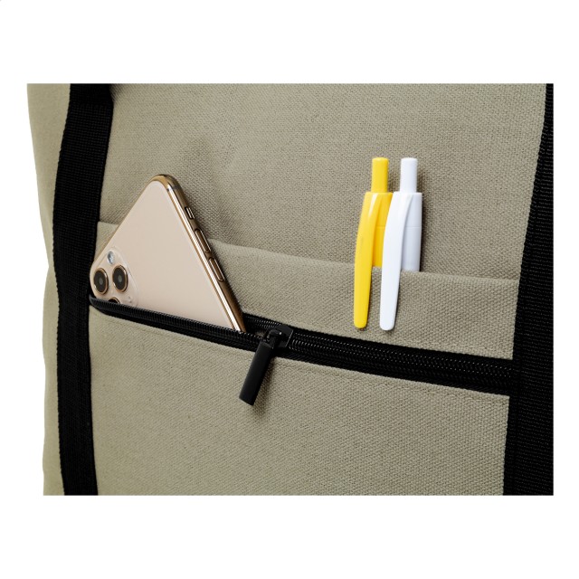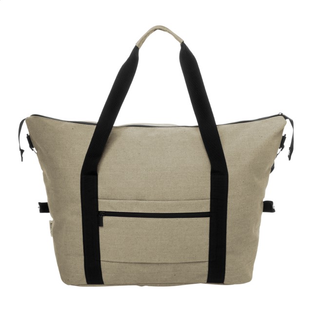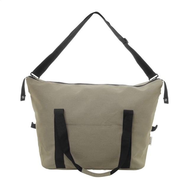 Cestovní / sportovní taška z recyklovaného plátna s hlavním oddílem na zip, přední kapsou, nastavitelným ramenním popruhem a zadní kapsou na zip, která slouží jako popruh na vozík. 70% recyklované bavlny a 30% RPET polyesteru. S výrazným štítkem z recyklované bavlny.