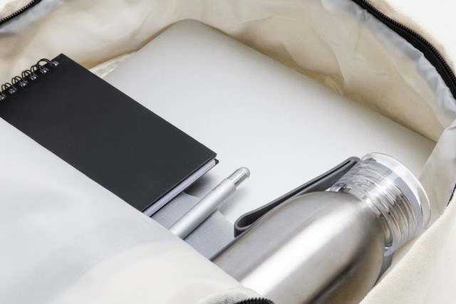 Recyklovaný plátěný batoh s hlavní přihrádkou na zip, polstrovanou přihrádkou na notebook (15"), 2 předními kapsami na zip, bočními kapsami, popruhem na kolečkách, polstrovanými zády a ramenními popruhy. 70% recyklované bavlny a 30% RPET polyesteru. S výrazným štítkem recyklované bavlny.