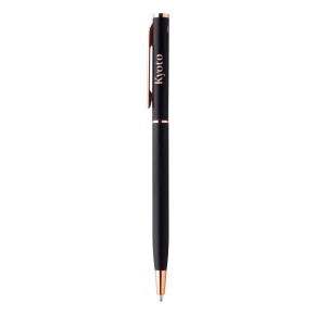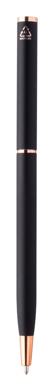 Kuličkové pero z recyklovaného hliníku s pogumovaným povrchem a detaily z růžového zlata. Se speciální povrchovou úpravou pro zrcadlové laserové gravírování v barvě růžového zlata. S modrou náplní.