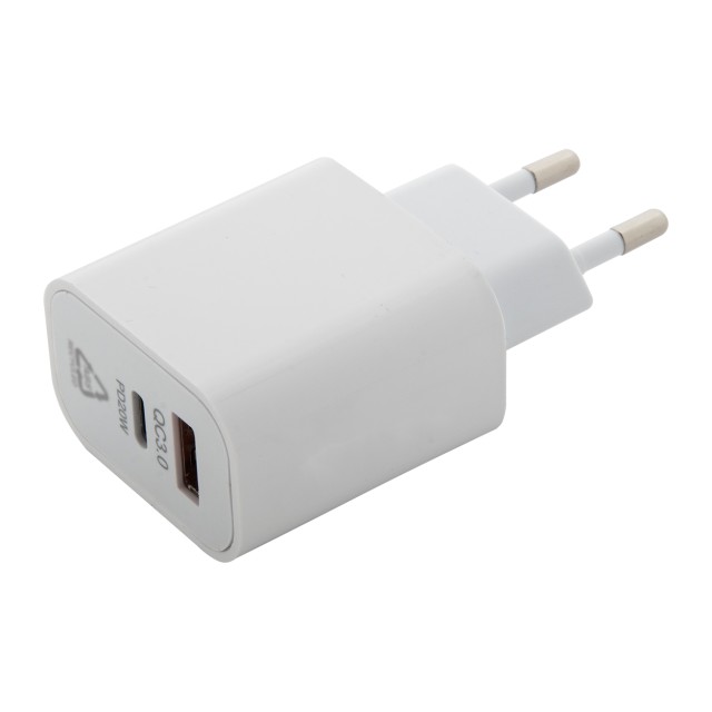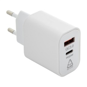 Recyklovaná ABS rychlonabíjecí USB nástěnná nabíječka s 1 USB a 1 USB-C portem. Podporuje technologii rychlého nabíjení (PD20W / QC3.0). S 2-pólovou evropskou zástrčkou.