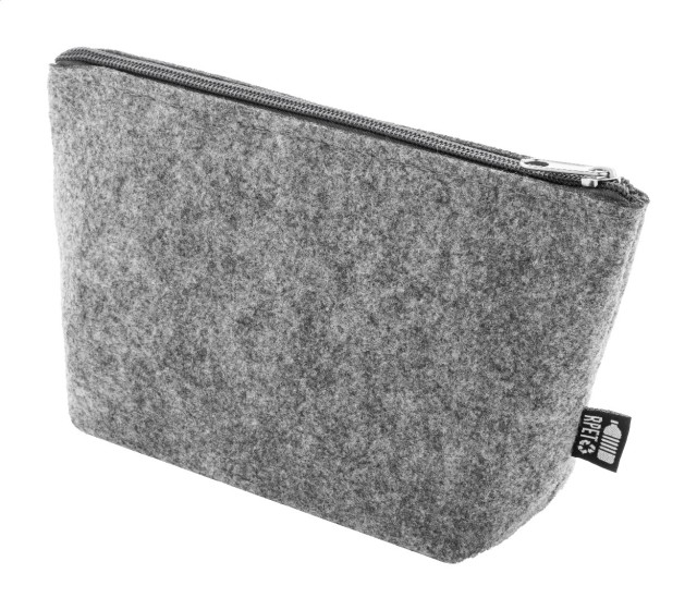 Kosmetická taška z RPET plsti na zip. S výraznou etiketou z RPET.