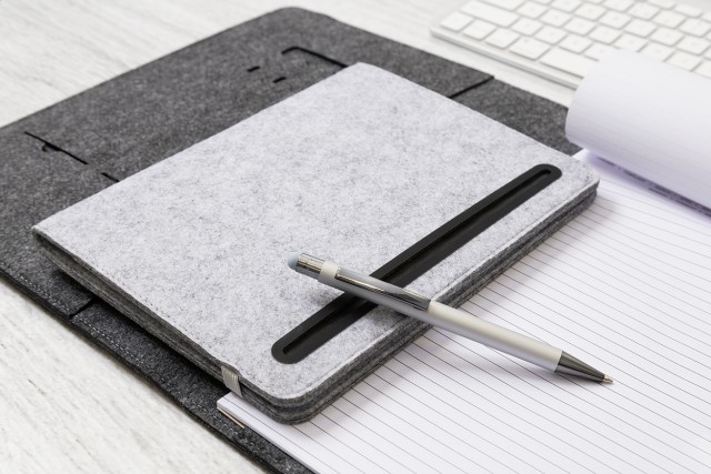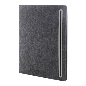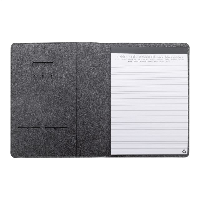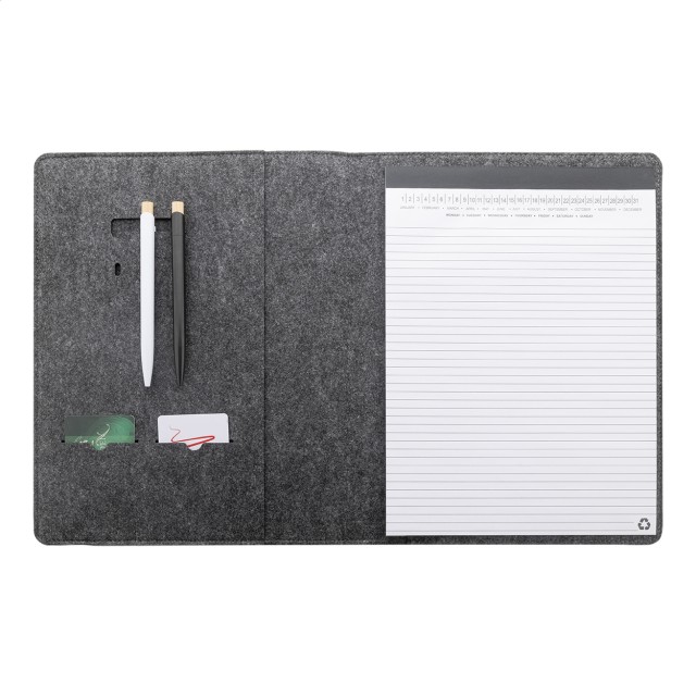 Plstěná sloha A4 na dokumenty z RPET s předními a několika vnitřními kapsami s organizérem. S 20 linkovanými listy poznámkového bloku z recyklovaného papíru.