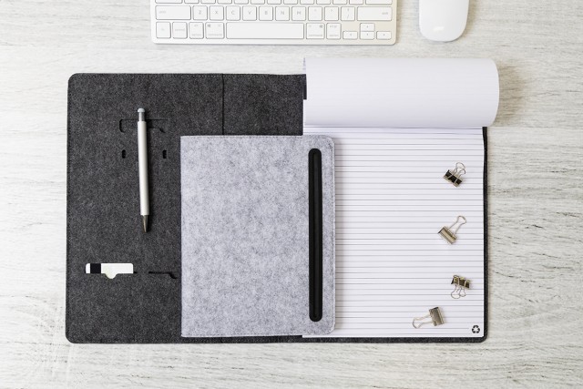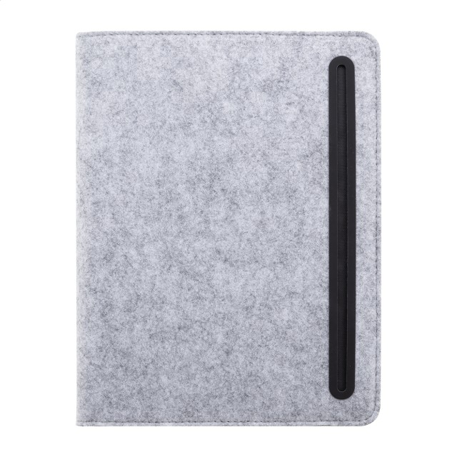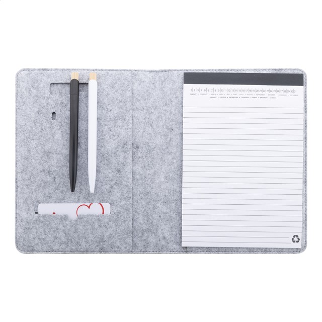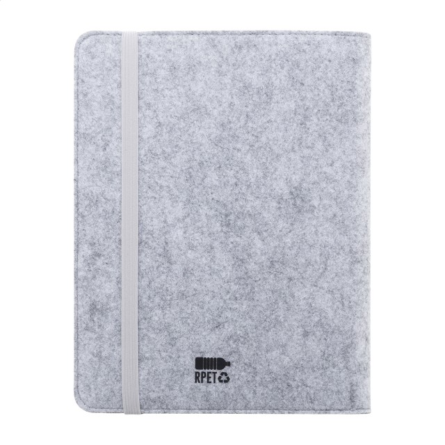 Plstěná sloha A5 na dokumenty z RPET formátu A5 s předními a několika vnitřními kapsami s organizérem. S 20 linkovanými listy poznámkového bloku z recyklovaného papíru.