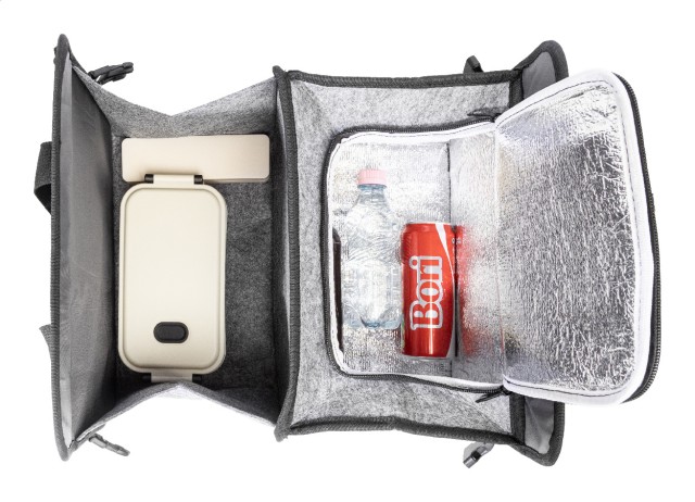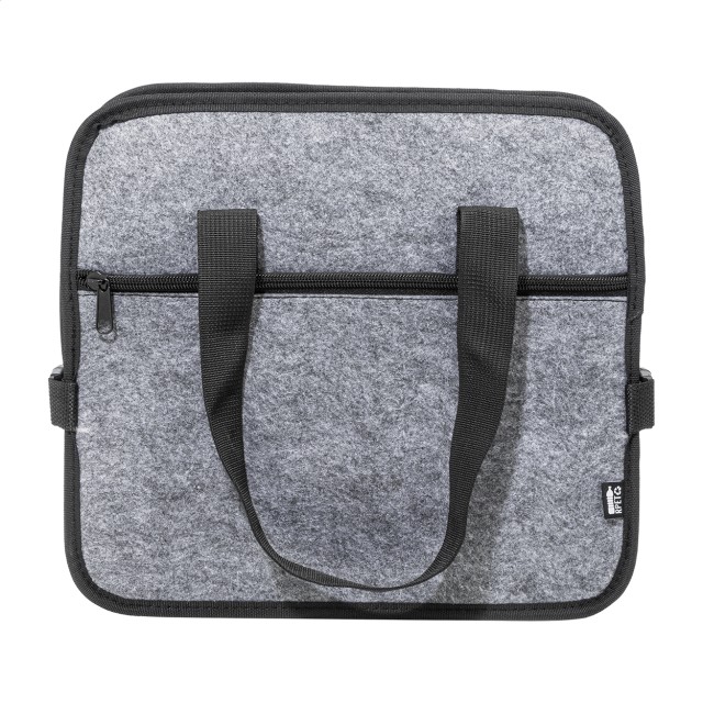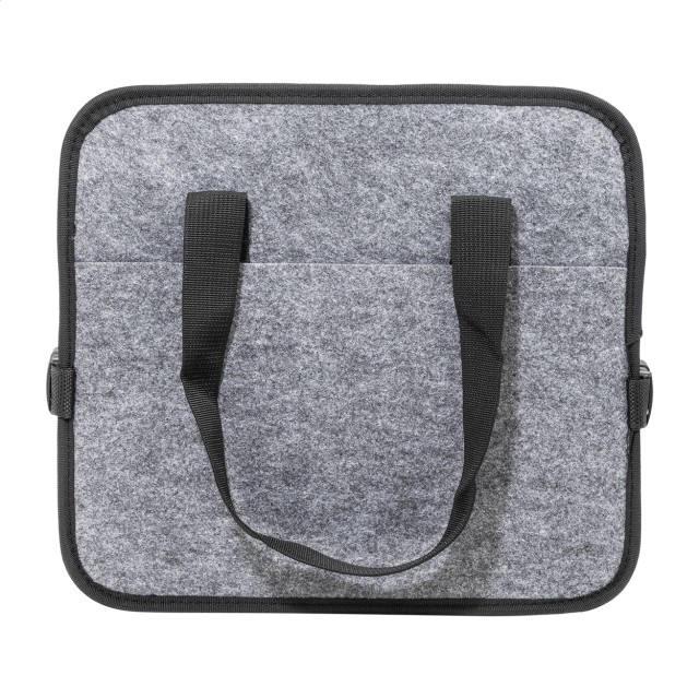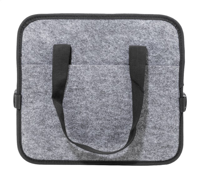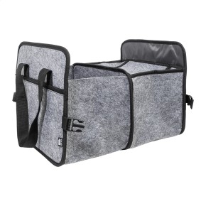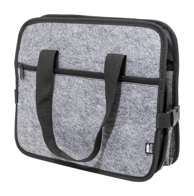 Skládací organizér do kufru auta z plsti RPET s přední kapsou na zip, dlouhými uchy a bočními přezkami pro pohodlné uložení. Obsahuje jednu otevřenou úložnou přihrádku a jednu chladicí přihrádku na zip s hliníkovým polstrováním. S výrazným štítkem RPET.