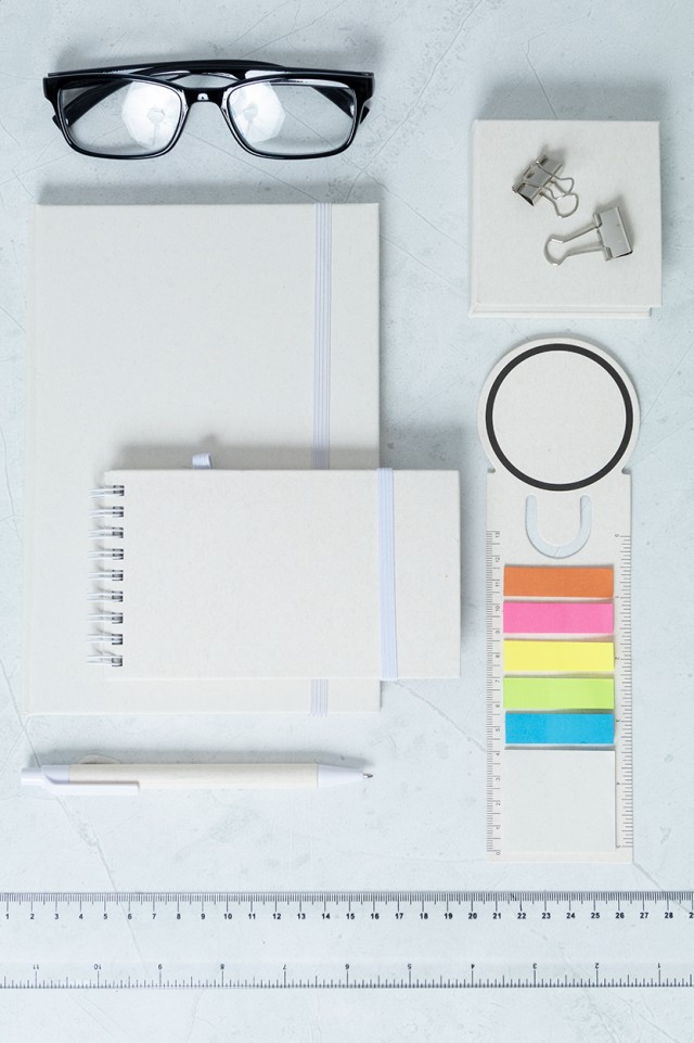 Spirálový blok A6 s deskami z recyklovaného z kartonu na mléko s pevnou vazbou a 70 linkovanými listy. Se spirálovými kroužky ve stejné barvě, gumičkou a poutkem na pero. Včetně recyklovaného kartonového papíru na mléko a recyklovaného ABS plastového kuličkového pera s modrou náplní.