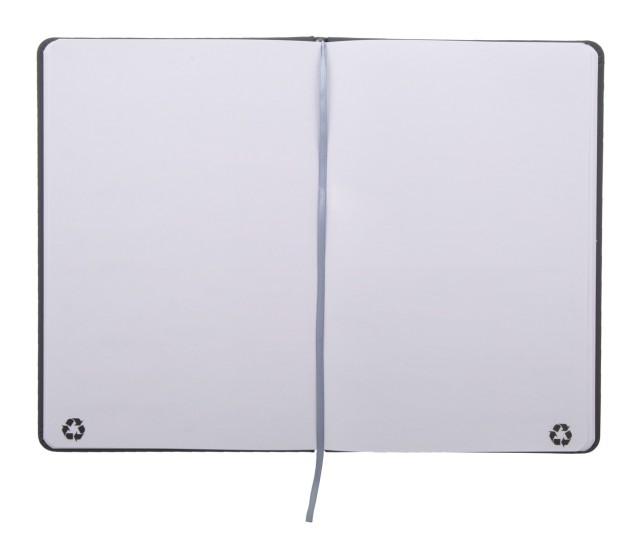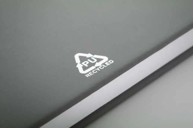 Blok A5 z recyklované PU kůže se 100 čistými listy z recyklovaného papíru. Se záložkou v odpovídající barvě a gumičkou.