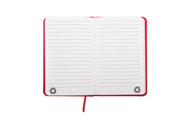 Blok potažený recyklovanou PU kůží se 100 linkovanými listy z recyklovaného papíru. Se záložkou v odpovídající barvě a gumičkou. Velikost A6.