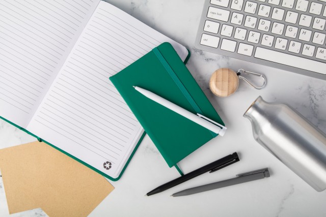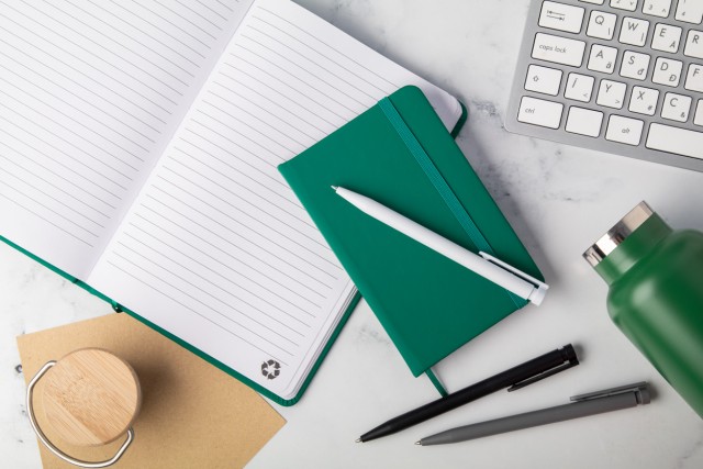 Blok potažený recyklovanou PU kůží se 100 linkovanými listy z recyklovaného papíru. Se záložkou v odpovídající barvě a gumičkou. Velikost A6.