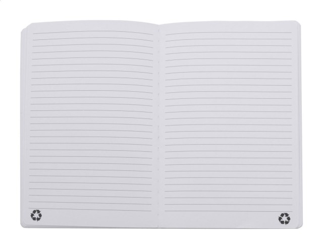 Blok A5 z recyklované PU kůže s měkkou vazbou s 80 linkovanými listy z recyklovaného papíru. Se záložkou v odpovídající barvě a gumičkou.