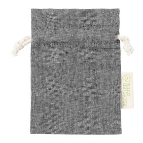 Dárkový pytlík z recyklované bavlny se stahováním na šňůrku. S výrazným štítkem z recyklované bavlny. 100% recyklovaná bavlna, 120 g/m².