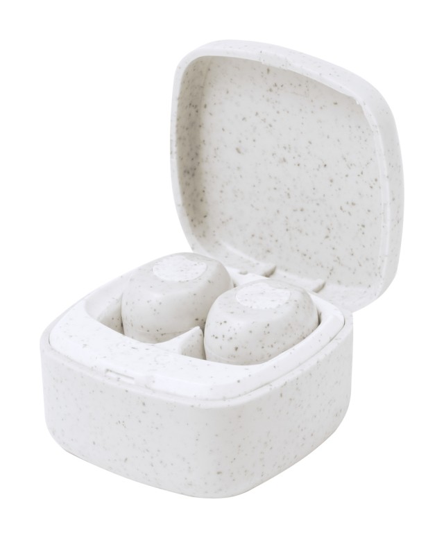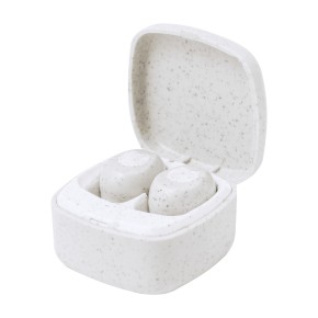 Ekologická plastová sluchátka s pšeničnou slámou, skutečně bezdrátová stereofonní sluchátka (TWS) s funkcí handsfree volání v nabíjecím pouzdře. Včetně nabíjecího kabelu USB.