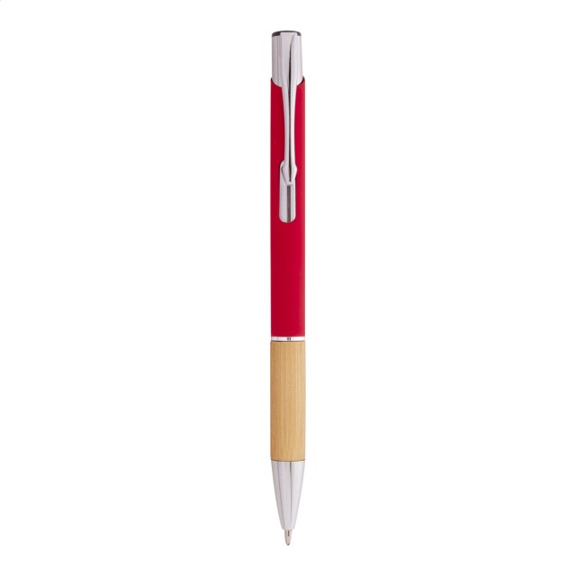 Hliníkové kuličkové pero s bambusovým úchopem, pogumovaným povrchem a modrou náplní. Se speciální vrstvou pro zrcadlové laserové gravírování.