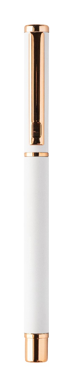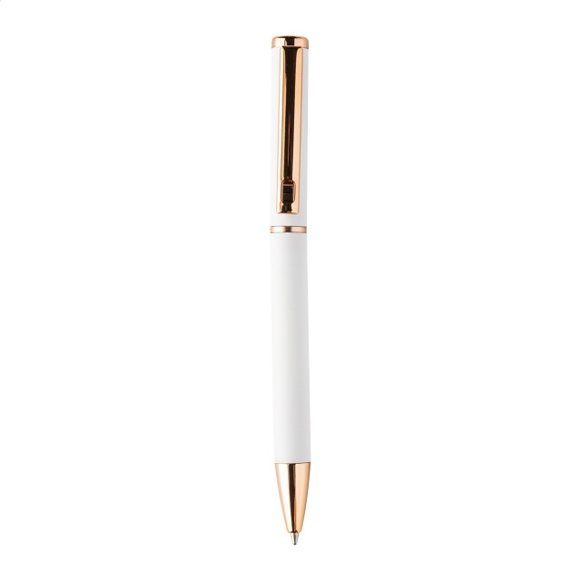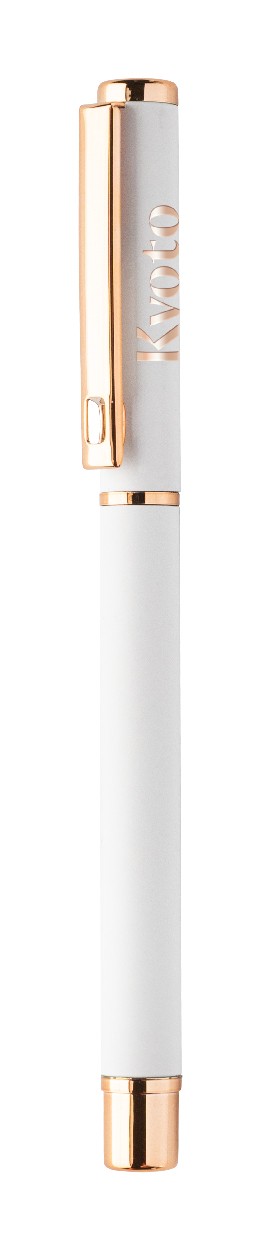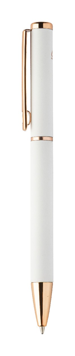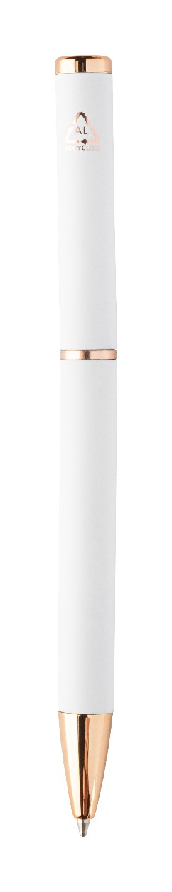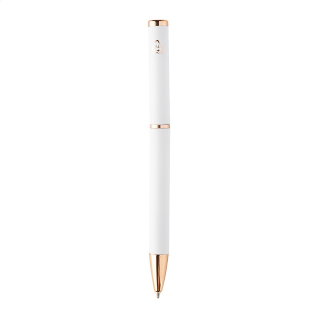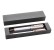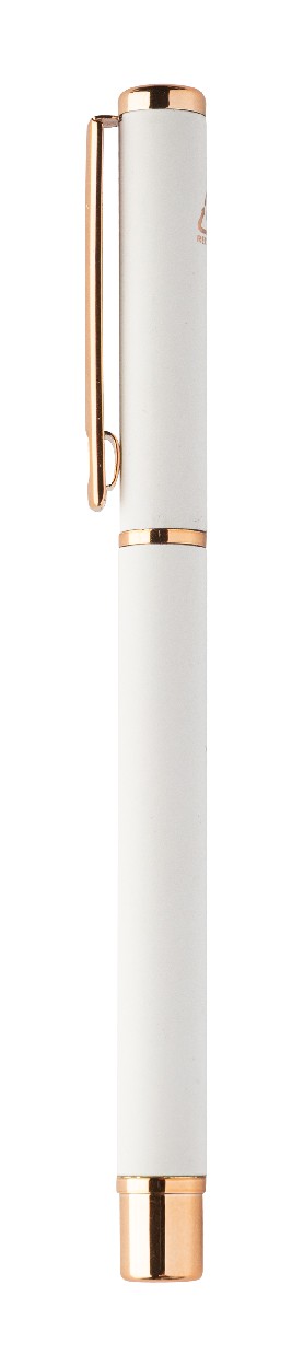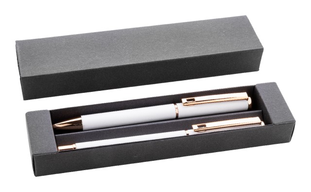 Sada per z recyklovaného hliníku s kuličkovým perem a rollerem s pogumovaným povrchem a detaily růžového zlata. S modrou náplní. Se speciálním povrchem pro zrcadlové laserové gravírování v růžovo-zlaté barvě. V černé papírové dárkové krabičce.