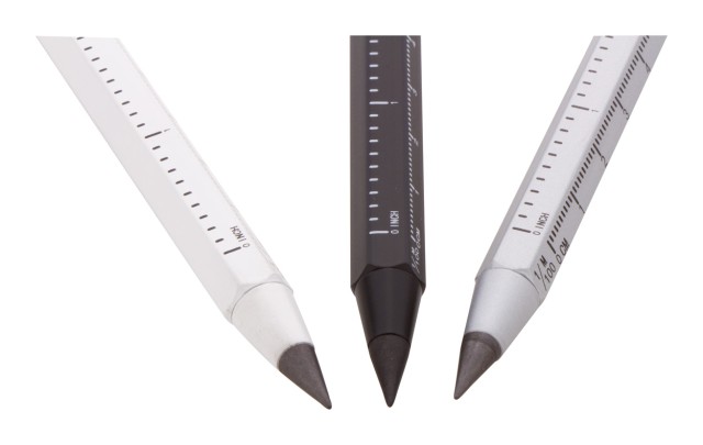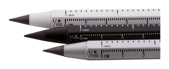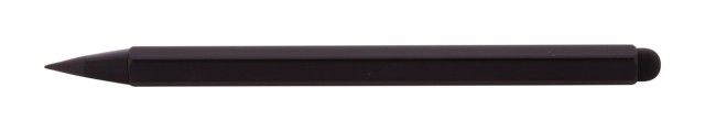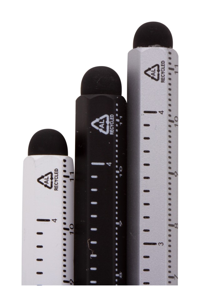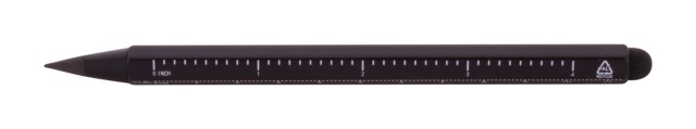 Bez inkoustové pero s dlouhou životností z recyklovaného hliníku s dotykovým stylusem a hrotem z kovové slitiny, který oxiduje papír. S šestihrannou hlavní včetně pravítek 11 cm a 4 palce. Toto pero píše podobně jako tužka a navíc je stíratelné.
