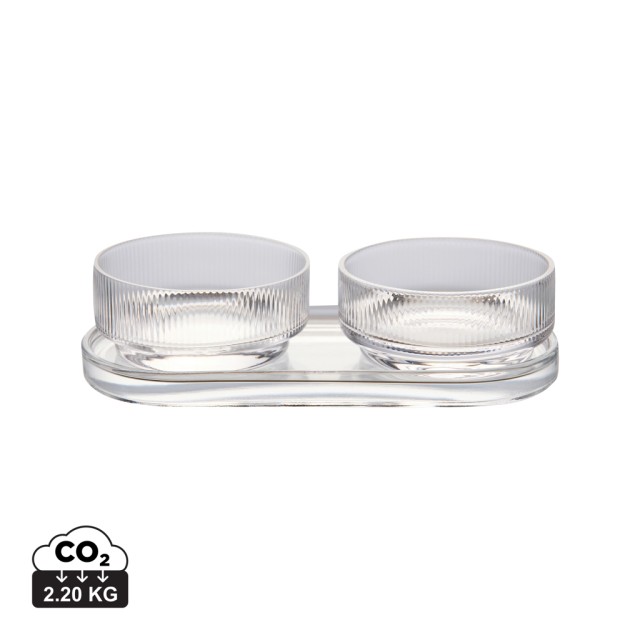 Tapas sada s nadčasovým designem a klasickými, čistými liniemi. Ideální pro každou příležitost, kdy chcete stylově a elegantně servírovat malé pokrmy, občerstvení nebo jiné přílohy. Sada obsahuje dvě misky a podnos, které lze používat společně nebo samostatně. Vyrobeno ze sodnovápenatého skla. Mísy mají objem 250 ml. Lze mýt v myčce nádobí.