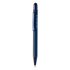 Recyklované hliníkové kuličkové a dotykové pero s pogumovaným tělem a barevnými lesklými kovovými částmi. Se speciální vrstvou pro zrcadlové gravírování odpovídající kovovým částem. S modrou náplní.