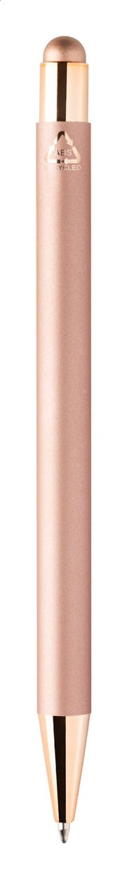 Recyklované hliníkové kuličkové a dotykové pero s pogumovaným tělem a barevnými lesklými kovovými částmi. Se speciální vrstvou pro zrcadlové gravírování odpovídající kovovým částem. S modrou náplní.