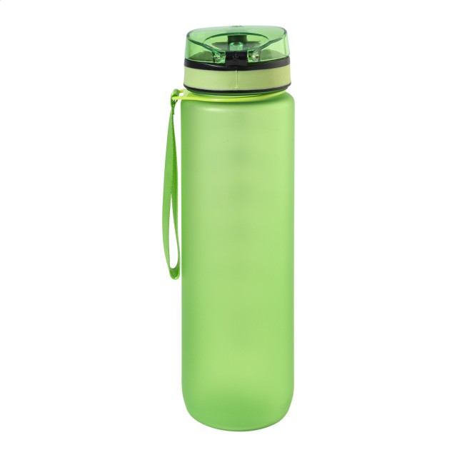 Sportovní láhev z matného RPET s motivačním objemovým a časovým značením, s automaticky otevíratelným odklápěcím víčkem s bezpečnostním zámkem a poutkem na nošení. 1000 ml. Bez BPA. Nevhodné pro sycené nápoje.
