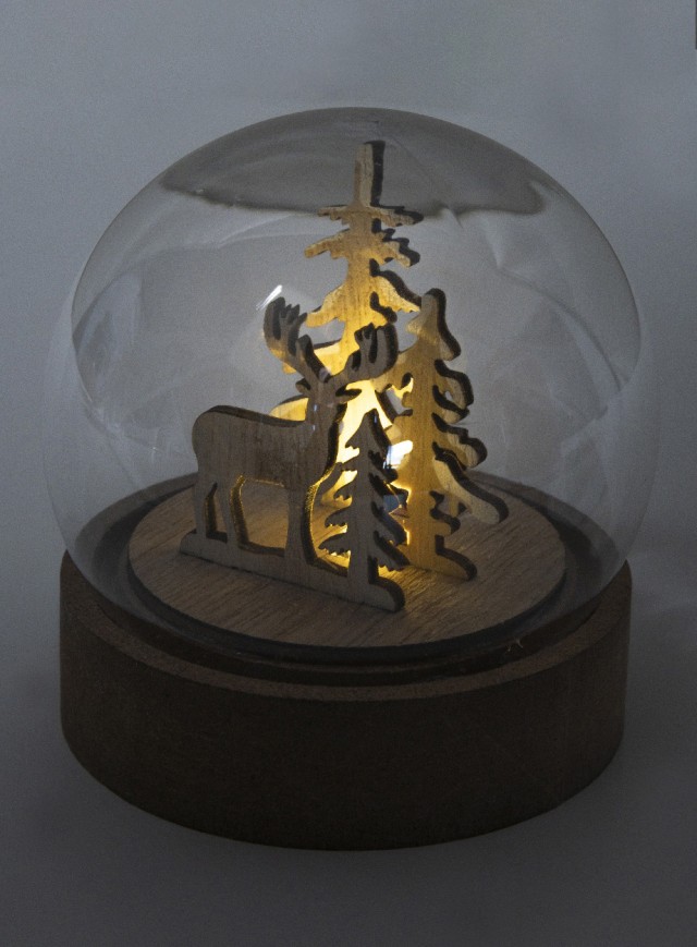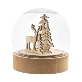Vánoční dekorace ve tvaru sněhové koule, osvětlená, na dřevěném podstavci z MDF s LED světlem. Včetně knoflíkových baterií. S tlačítkem ZAP/VYP na podstavci.