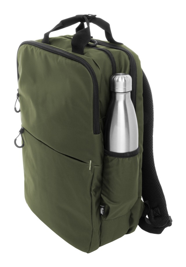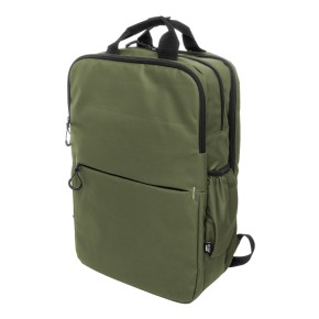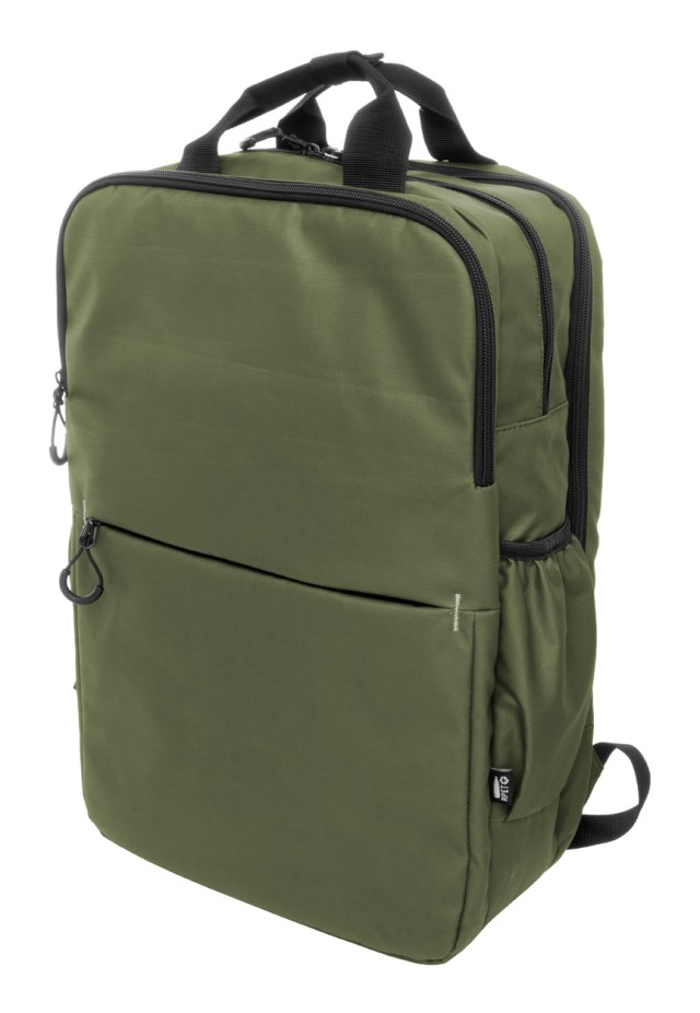 Vodotěsný batoh RPET se 2 přihrádkami na zip, 2 předními kapsami na zip, bočními kapsami a polstrovanou přihrádkou na notebook (16"). S popruhem na vozík, polstrovanými zády a ramenními popruhy. Polyester 600D RPET potažený PU, s výrazným štítkem RPET.