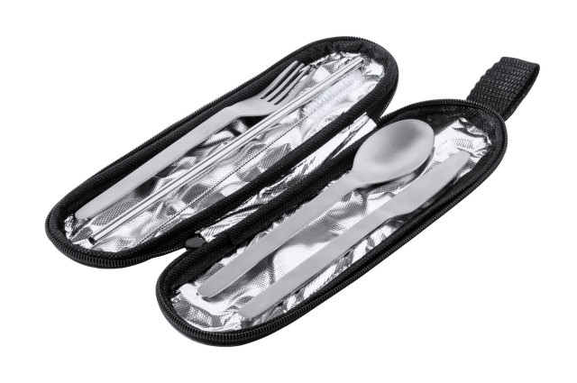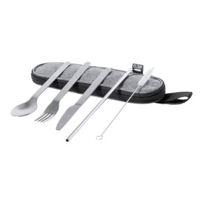 5dílná sada příborů z nerezové oceli v polyesterovém pouzdře RPET. Včetně vidličky, nože, lžíce, brčka a čisticího kartáčku.
