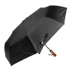 Velký, plně automatický (otevřít/zavřít) větruodolný skládací deštník s 8 panely a elegantní dřevěnou rukojetí s poutkem na ruku. S kovovým rámem a žebry ze skelných vláken. 190T RPET pongee. S charakteristickým RPET štítkem.