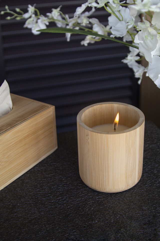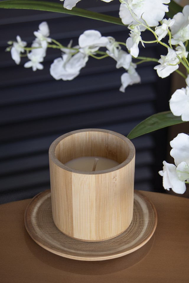 Rostlinná vosková svíčka s vůní vanilky v bambusovém držáku. Se 160 gramy vosku. V kraftové papírové krabici.