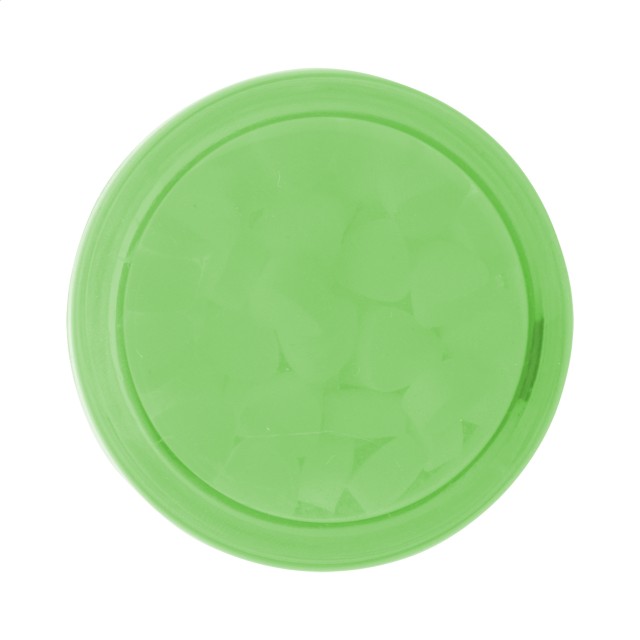 Kulatá průhledná plastová dóza s mintovými bonbóny s barevným šroubovacím víčkem. Obsahující cca. 12 gramů mentolových bonbonů bez cukru.