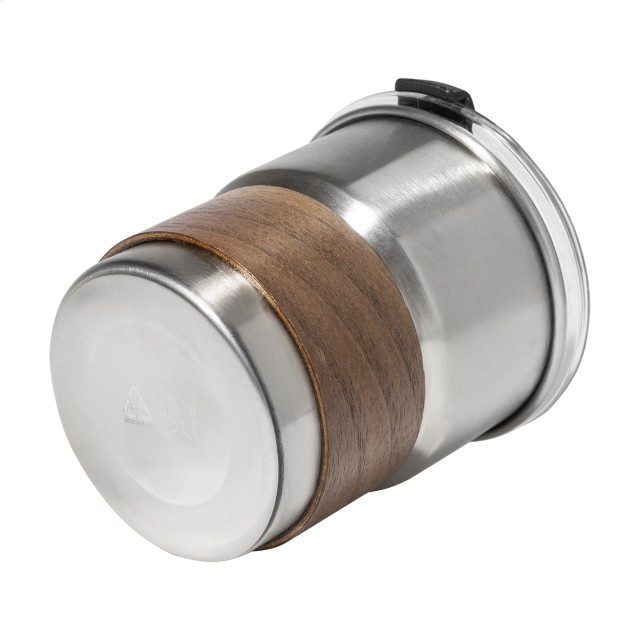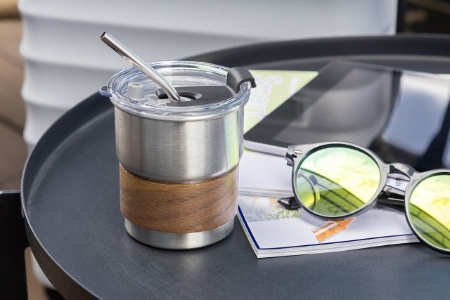 Jednostěnný cestovní hrnek z recyklované nerezové oceli s úchopem z ořechového dřeva, plastovým víčkem a brčkem z recyklované nerezové oceli. 260 ml.