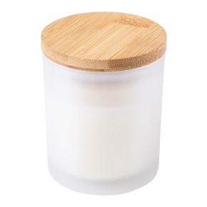 Vonná svíčka s vůní vanilky ve skleněné nádobě s bambusovým víčkem.