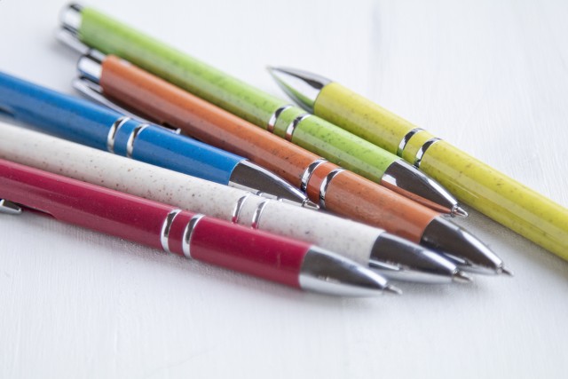 Kuličkové plastové pero z ekologických částí z pšeničných stébel, s modrou náplní.