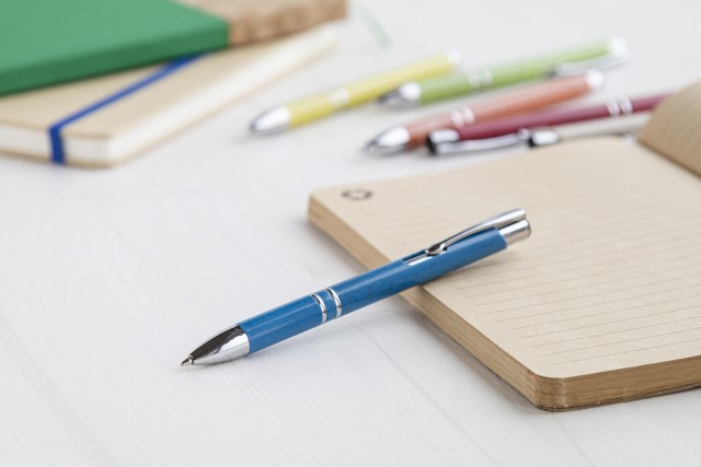 Kuličkové plastové pero z ekologických částí z pšeničných stébel, s modrou náplní.