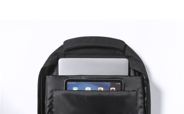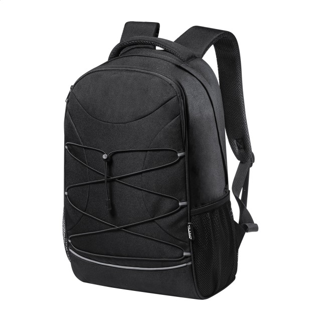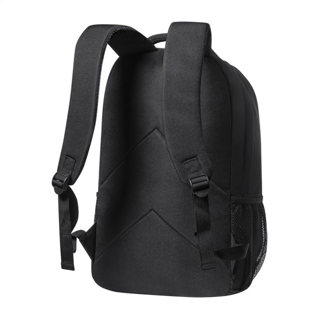 Batoh RPET s přihrádkami na zip, bočními kapsami ze síťoviny, elastickými šňůrkami vpředu, polstrovanou přihrádkou na notebook (15") a tablet (12"), polstrovaná záda a ramenní popruhy. S výrazným štítkem RPET. Polyester 600D RPET.